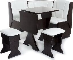 Кухонный уголок Нарцисс позволит оборудовать даже самую маленькую кухню максимально комфортно и удобно «для себя любимого». Все лучшее от мебельной фабрики Бител – качество, комфорт, ящики для хранения, столешница с покрытием пластиком, складной стол недорого в одном комплекте. На угловом элементе есть полочка. Этот комплект выполнен в варианте обивки Барнео Крем. Матовая экокожа, однотон. Цвет корпуса венге. В комплект кухонного уголка Нарцисс входит: стол раскладной СКР1, два табурета Тюльпан, кухонная скамья с размером 1100 мм на 1100 мм, с внутренними ящиками под сидением. Габариты высота: 1100 мм. Габариты ширина: 1100 мм. Габариты глубина: 840 мм. Стиль: Классика. Материал каркаса: ЛДСП. Обивка: экокожа. Цвет обивки: Милк. Ящик для хранения: да. Цвет корпуса: Венге.