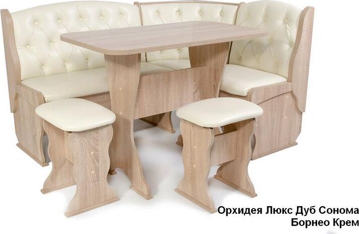 В комплект кухонного уголка Орхидея Люкс входит: стол обеденный со столешницей в цвет корпуса с термостойким покрытием. два табурета Тюльпан, кухонная скамья с размером 1100 мм на 1500 мм, с внутренними ящиками для хранения под сидением, декор мягкой части каретная стяжка. Самый солидный вариант расцветки в экокоже Барнео Умбер. Достойно смотрится на любой кухне, но особенно хорошо в классическом интерьере. Не требует тщательного ухода, практичен в уборке, достойно будут смотреться и в интерьере загородного дома. Размеры: скамья: 1500*1100*850 мм стол: 1000*580*750 мм табурет: 380*300*440 мм.