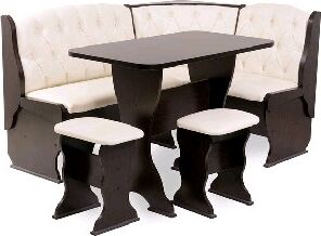 Набор мебели для кухни с классической красивой каретной стяжкой, включающий в себя угловую скамью, стол и два табурета.В угловой скамье под сиденьями расположены два ящика .Каркас ЛДСП.Покрытие верхней части столешницы стола термостойкий пластик, кромка ПВХ 1мм. Угловая скамья собирается как в правом ("Г"), так и в левом исполнении ("7"). Углы столешницы закруглены для избежания травмирования и придания лучшего эстетического вида.Каракс выолнен из темного ЛДСП Декор Венге, Обивка мягких частей выполнена из мягкой экокожи Барнео Крем ( Кремовый цвет ) с каретной классической стяжкой. Размер угловой скамьи по длине 1500х1100 или 1100х1500 в зависимости от сборки ( "Г" или "7"), высота угловой скамьи 840, глубина угловой скамьи 530.Размер столцы стола 1000х580, высота стола 750. Размер сденья табуерта 300х380, высота табурета 450.
