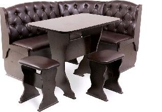 Набор мебели для кухни с классической красивой каретной стяжкой, включающий в себя угловую скамью, стол и два табурета.В угловой скамье под сиденьями расположены два ящика .Каркас ЛДСП.Покрытие верхней части столешницы стола термостойкий пластик, кромка ПВХ 1мм. Угловая скамья собирается как в правом ("Г"), так и в левом исполнении ("7"). Углы столешницы закруглены для избежания травмирования и придания лучшего эстетического вида.Каракс выолнен из темного ЛДСП Декор Венге, Обивка мягких частей выполнена из мягкой экокожи Барное Умбер ( Темношоколадный цвет) с каретной классической стяжкой. Размер угловой скамьи по длине 1500х1100 или 1100х1500 в зависимости от сборки ( "Г" или "7"), высота угловой скамьи 840, глубина угловой скамьи 530. Размер столешницы стола 1000х580, высота стола 750. Размер сденья табуерта 300х380, высота табурета 450.