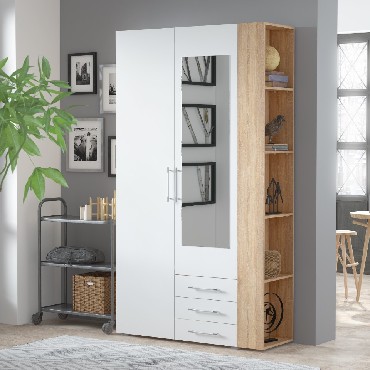 Материал фасадов – ЛДСП16мм Белый. Материал каркаса – ЛДСП16мм Дуб сонома. Кромка ПВХ толщиной 0,45мм в цвет материала. Зеркало с обработкой по периметру. Опора пластиковая регулируемая, высота 20мм. В комплекте фурнитура для крепления к стене. За одной дверью выдвижная вешалка для одежды. За второй дверью полки. Открытый стеллаж с полками. Ящики на роликовых направляющих. Возможна сборка на правую и левую сторону. Размеры: ШхВхГ (1198х2140х410)мм МАТЕРИАЛ КОРПУСА ЛДСП Страна производства: Россия. ГАРАНТИЯ24мес.