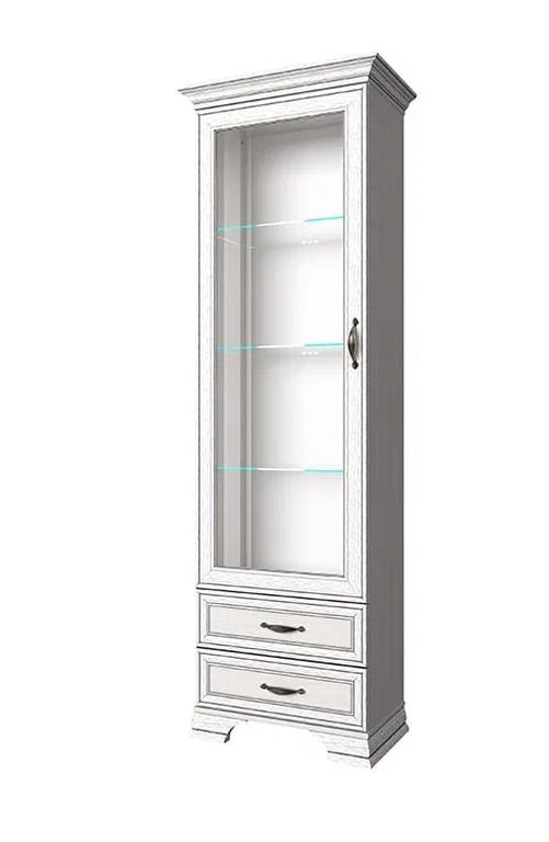 Особенности шкафа: Подчеркнёт роскошный интерьер в классическом стиле гостиной и столовой комнаты. Отделение с полками за витриной и два выдвижных ящика. Рамочнофиленчатый фасад (патинированная планка из МДФ, филенка  ЛДСП). Металлические ручки (сплав цинка и алюминия). Шариковые направляющие полного выдвижения. Декоративная корона, ножки из МДФ. Полки из закалённого стекла толщиной в 6 мм, витрина – 4 мм. Имеет универсальную сборку.