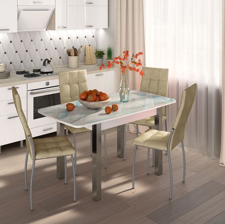 Раскладной стол на кухню необычной расцветки. Стол ФЛОРИДА раздвижнойстолешница изготовлена из ЛДСП 16 мм, сверху стекло 4 мм с фотопечатью. Механизм трансформации «Бабочка», позволяющий увеличить длину столешницы до 1420 мм. Ножки квадратные, хромированные. Подстолье выполнено из ЛДСП в цвете: белый. Размеры: 1050(1420)х750х750 мм