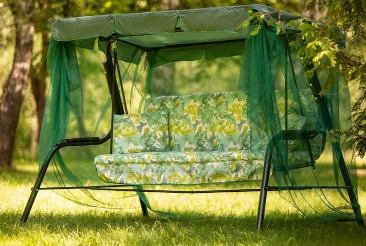 Габаритные размеры изделия (длина х ширина х высота), мм: 2310х1260х1478 Габаритные размеры сиденья,спинки и тента (длина х ширина), мм: размеры сиденья: 1706х497 размеры спинки: 1706х497 размер тканевого тента: 1840х1020 Максимальная нагрузка, кг: 210 Каркас: труба стальная O45х1,4мм; полимерное покрытие; полка 2 шт. Мягкий элемент: ткань 45% п/э – 55% хлопок, плотность 108111г/м2, наполнитель мягкого элемента аэрофом 50мм+синтепон, основание спанбел, наполнитель подушек синтепон. Подушки – 2шт. Тент с сеткой противомоскитной: ткань с водоотталкивающей отделкой 100% п/э плотность 80г/м2. Противомоскитная сетка пришита к тенту. Регулировка спинки: осуществляется звеньями цепи на требуемый угол наклона. Размеры упаковки, мм: 526х186х1966 Вес изделия: нетто, кг – 35,2 брутто, кг – 35,8