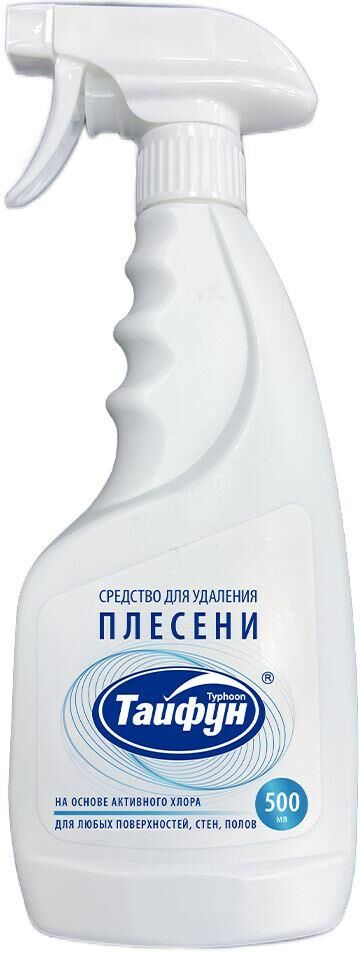 ТАЙФУН Средство для удаления плесени, 500мл. Уничтожает плесень, грибы, бактерии. Придает гигиеническую чистоту. Справляется с неприятными запахами. Применяетcя для стен, полов, потолков, раковин, унитазов, межплиточных швов, лотков домашних животных, отсеков стиральных машин, душевых кабин.Средство содержит активный хлор. Перед применением проверьте стойкость материалов на незаметном участке. Встряхните флакон. Поверните колпачок в рабочее положение. С расстояния 2030 см нанесите средство на плесень и загрязнения и оставьте на 510 минут, затем смойте. При необходимости повторите процедуру.