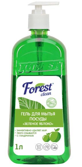 FOREST CLEAN Гель для мытья посуды "Зеленое яблоко" 1 л Гелеобразное, Phнейтральное средство для мытья кухонной посуды. Можно использовать для мытья столовых приборов, устройств и аппаратов, тары, столов и другого оборудования, а также для мойки овощей, фруктов и рук. Эффективно против пищевых загрязнений на любых влагостойких покрытиях: ст клах, хрустале, кафеле, керамике, пластмассах, металлах, древесине и окрашенных поверхностях. Легко смывается. Прида т блеск.