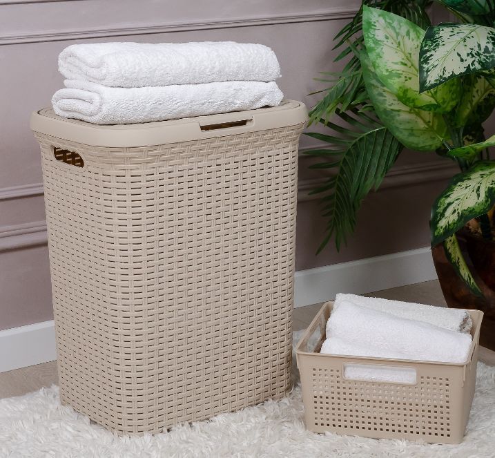 Цвет латте. РАазмер 346 x 445 x 560 мм. Материал Полипропилен. Емкость для накопления грязного белья перед стиркой. В объеме 60л комфортна для использования в семье на несколько человек. Крышка закроет содержимое от взглядов и послужит препятствием для распространения возможных посторонних запахов. Округлая форма удобна для размещения корзины в небольших помещениях (ванных комнатах, кладовых и гардеробных). Текстура с имитацией натурального плетения «Ротанг» привнесет уют в ваш интерьер и придаст индивидуальность.