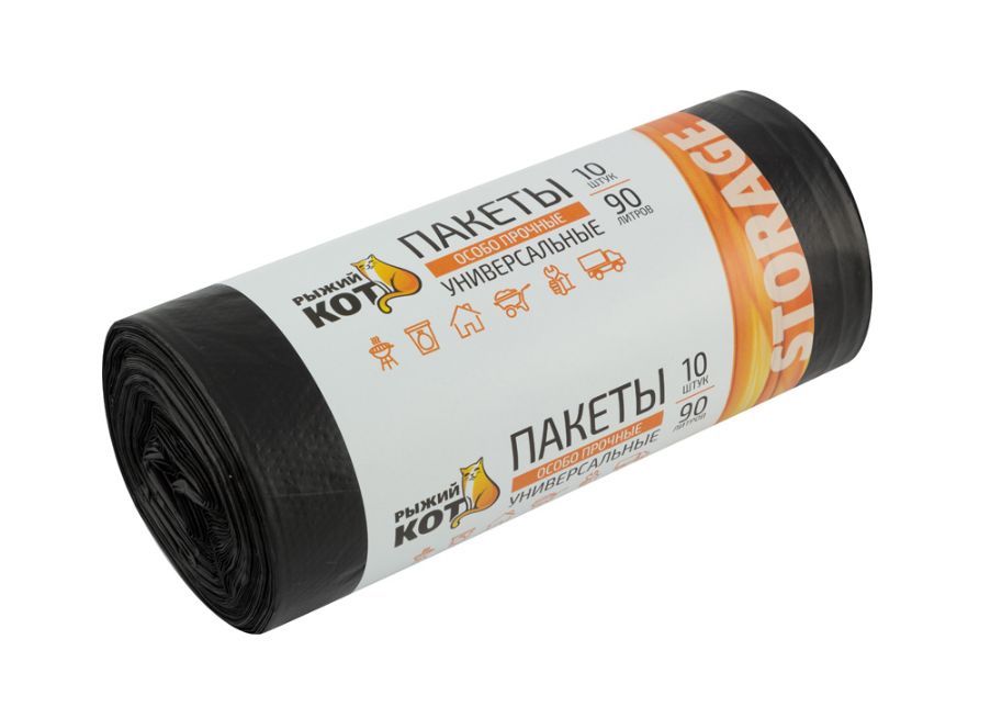 РЫЖИЙ КОТ Пакеты универсальные 90л (10шт./рул.) особо прочные, ПВД, черные, 40мкм (310409)