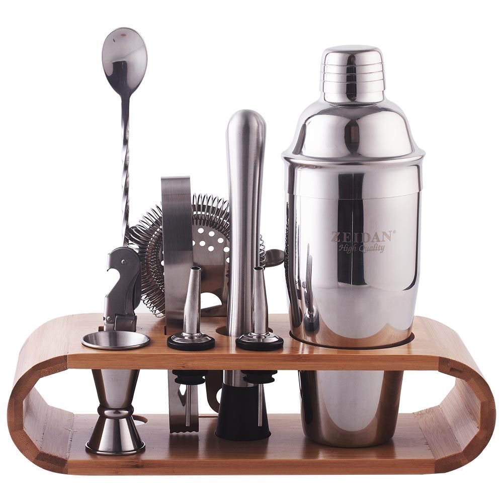 Набор для приготовления коктейлей ZEIDAN Z11055 10 предм., Набор для приготовления коктейлей, 10 предметов из высококачественной нержавеющей стали: шейкер 700 мл, щипцы для льда 16х1.8 см, стрейнер 15.2х11.4 см, штопор 12х2.1 см, мадлер 20х3.3 см, барная ложка, джиггер 15/30 мл, 2 гейзера, подставка из бамбука 30х7 см