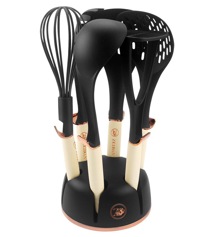 ZEIDAN Z2066 Кухонный набор ZEIDAN Z2066 7 предметов, Кухонный набор 7пр. ВЫСОКОКАЧЕСТВЕННЫЙ ЖАРОПРОЧНЫЙ НЕЙЛОН, подставка, лопатка с прорезями, шумовка, половник, картофелемялка, ложка для спагетти, венчик для взбивания, ручки softtouch с декоративным элементом "под золото" . Подарочная упаковка с пластиковой ручкой.