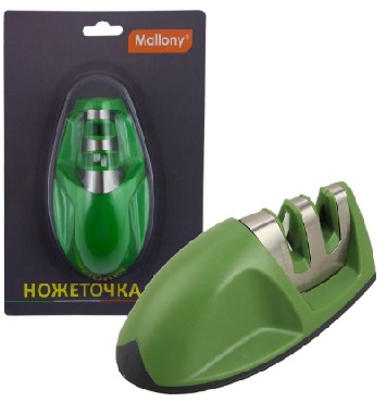 Ножеточка KS3 Размер: 10*5*4,8см Материал: пластик, металл, керамика. Упаковка: одинарный блистер Настольная точилка для ножей с двумя рабочими зонами применяется для всех видов металлических ножей от кухонных до туристических. Одна зона: металлические стержни (для первичной заточки), вторая зона: керамические стержни (для доводки лезвия ножа). Эргономична, удобно держать в руке и безопасна в эксплуатации.