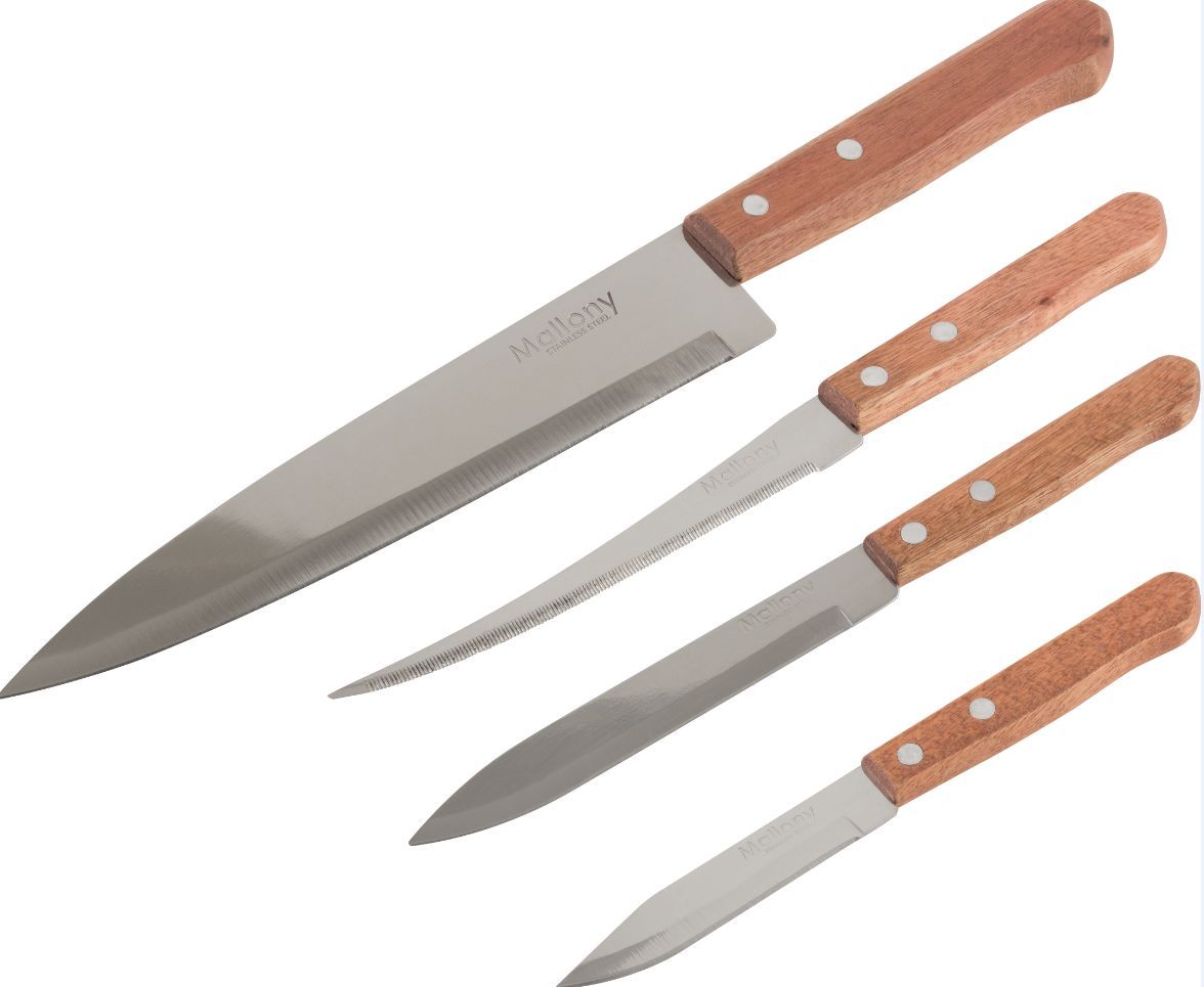 Набор ножей с деревянной рукояткой Состав набора: нож поварской (длина лезвия 20 см, толщина стали 1,2 мм) нож универсальный (длина лезвия 15 см, толщина стали 1,0 мм) овощной (длина лезвия 12,5 см, толщина стали 1,0 мм) овощной малый (длина лезвия 9 см, толщина стали 1,0 мм) Материал: нержавеющая сталь, дерево