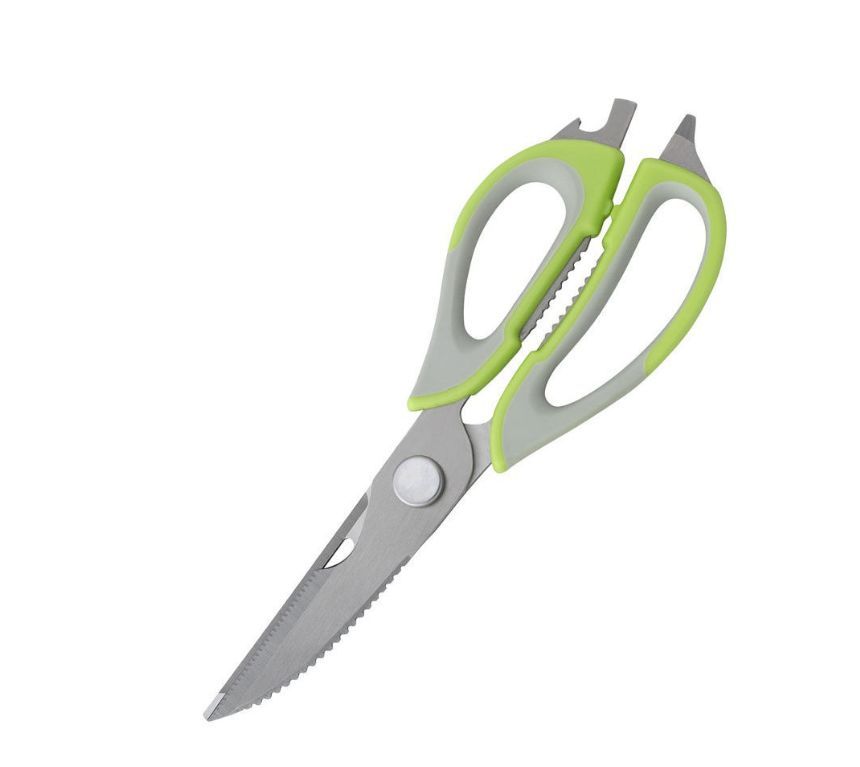 Длина ножниц: 22,8 см Удобный пластиковый чехол в комплекте Толщина стали: 2,8 мм Материалы: лезвие — нержавеющая сталь, ручка и чехол — пластик Ножницы предназначены для: разделки птицы; вскрытия картонных и полимерных упаковок; чистки рыбы, срезания плавников (съемные лезвия); в качестве ножа для овощей (съемные лезвия); в качестве щипцов для колки орехов; как консервный нож; как открывашку для бутылок; как овощечистку (съемные лезвия). Упаковка: европодвес