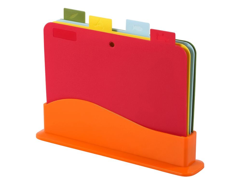 Набор разделочных досок 4 шт в наборе Каждая доска имеет специальную маркировку, что позволяет использовать ее для определенных продуктов Размер 1 шт: 29,00*22,5*0,2 см Вес набора: 630 гр Материал: полипропилен Упаковка: термоусадка с цветным стикером Преимущества: прочный безопасный пластик; 4 доски в комплекте; удобная маркировка; оптимальный размер; компактное хранение в подставке.