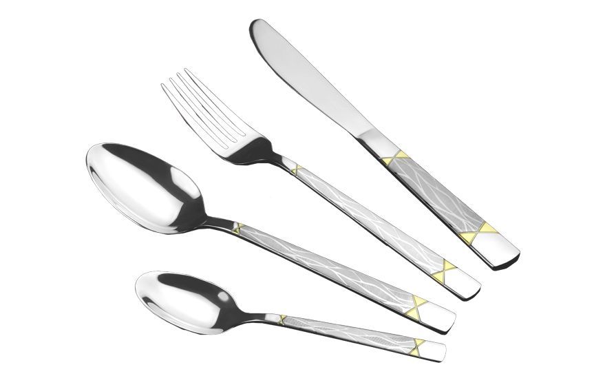 LARA LR1012/24 Набор столовых приборов LARA «PHOENIX» 24пр, Дизайн столовых предметов PHOENIX разрабатывался для торжественных случаев, чтобы украсить стол во время праздников. Лаконичная позолота, давшая идею для имени набора (ФЕНИКС), обрамляет матовые узорчатые лепестки, нанесенные методом лазерной гравировки. толовые приборы LARA изготовлены из стали с 18процентным содержанием хрома и имеют зеркальную полировку класса "А". Особое внимание уделено остроте зубьев вилки. Труднодоступные места между зубьями, в которых могут скапливаться остатки пищи, отполированы вручную так, чтобы сделать поверхность ровной и гладкой и повысить гигиеничность изделий. Глубина столовой ложки не менее 7 мм, и это обеспечивает оптимальную вместительность.