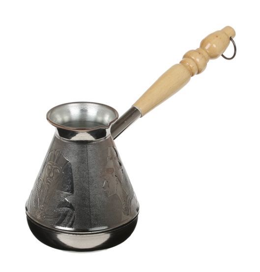 Турка изготовлена из меди, прекрасно подходит для приготовления настоящего кофе на плите. Внешняя поверхность имеет декоративное тиснение, что придает изделию оригинальный внешний вид. Внутренняя сторона покрыта пищевым оловом. Изделие оснащено небольшим носиком и удобной не нагревающейся деревянной ручкой с петелькой для подвешивания. Надежное крепление ручки гарантирует безопасное использование.