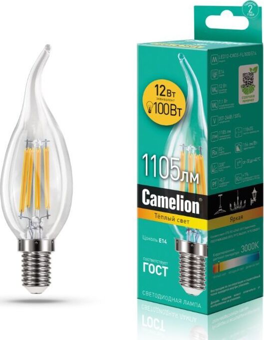 CAMELION LED12CW35FL/830/E14 (Эл.лампа светодиодная 12Вт 220В) Цоколь: E14 Мощность: 12 Вт Эквивалент ЛН: 100 Вт Световой поток: 1105 Лм Цветовая температура: 3000 K Напряжение: 170265 В Покрытие колбы: CL/прозрачная Тип трубки/колбы: CW35 Размеры: 96x35 мм Угол светового пучка: 330 ° Индекс цветопередачи (Ra): 82+ Коэффициент пульсации: < 1% Срок службы: 30000 часов Гарантия: 24 мес