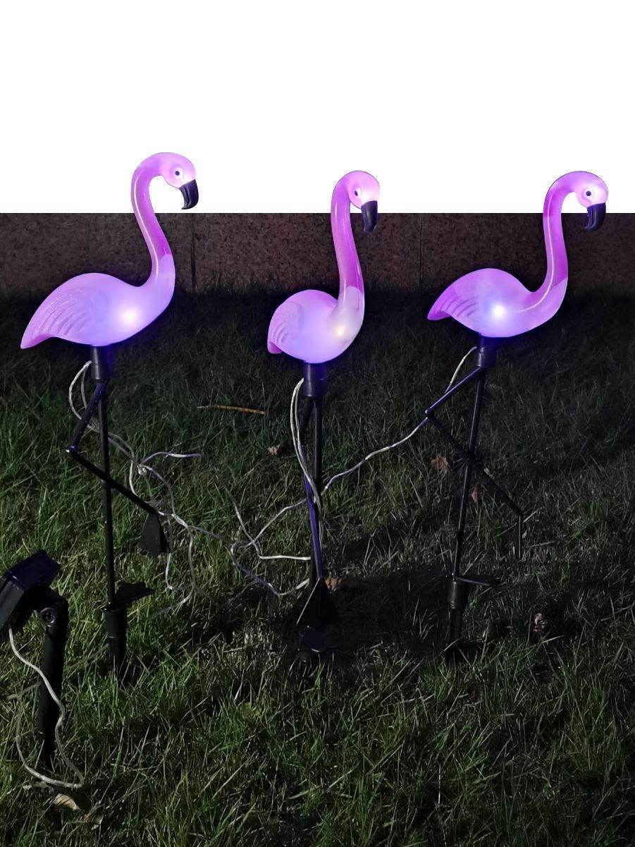 Беспроводной LEDсветильник «Фламинго» станет прекрасным украшением для вашего сада. Удобная конструкция — к солнечной панели с аккумулятором подключены 3 фонарикафламинго. Позволит разместить подсветку у клумбы, украсить пруд или территорию рядом с бассейном, оригинально подсветить тропинку или вход в террасу. Каждая фигурка высотой 52,5 см. Каждый фламинго оснащен двумя яркими светодиодами. Заряд аккумулятора осуществляется при свете солнца при включенном переключателе. С наступлением ночи фламинго загораются. Высота фламинго 52.5см. Аккумулятор в комплекте NIMH 600мАч, 1,2В. Время непрерывной работы при полностью заряженном аккумуляторе 8 часов. 6 ярких светодиодов белого света