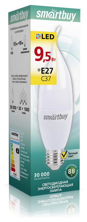 Характеристики SBLC37Can9_530KE27 Мощность, Вт 9,5 Аналог лампы накаливания 85 Высота, мм 125 Диаметр, мм 37 Диапазон рабочих температур 25..+50°C Индекс цветопередачи, CRI Ra>80 Материал Пластик, металл Колба Матовая пластик Напряжение, В 220240 В Световой поток, лм 760 Светоотдача 80 Совместимость с выключателем с подсветкой нет Срок службы 2 года Форма колбы свеча на ветру Цветовая температура, К 3000 Тип цоколя Е27