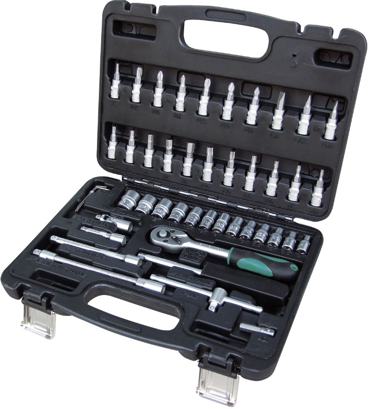 Набор ручного инструмента, Предметов в наборе 46 шт, материал Сталь CRV, Вес брутто 1,42 кг, Габариты упаковки 26x5x28 см, В КОМПЛЕКТЕ 1/4" Головки (13 шт), Головки торцевые 1/4" со вставкой (21 шт), Кардан шарнирный 1/4" (1 шт), Удлинитель 1/4": 50 мм (1 шт), Удлинитель 1/4": 100 мм (1 шт), Ключ трещеточный 1/4" (1 шт), Вороток Тобразный 1/4" (1 шт), Удлинитель гибкий 1/4" (1 шт), Отверткадержатель для бит (1 шт), Адаптер шестигранный (1 шт), Ключ шестигранный (4 шт).
