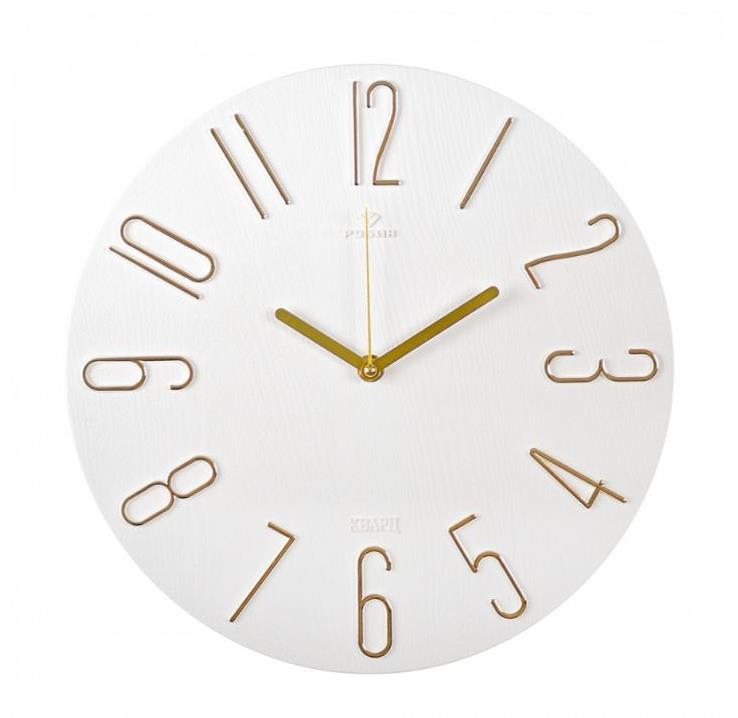 3010002 (10) Часы настенные d=30см, корпус белый+золото "Классика" ХАРАКТЕРИСТИКИ РАЗМЕР (ДХВХШ) 300х300х20 мм АРТИКУЛ 3010002 КОЛИЧЕСТВО В КОРОБКЕ 10 МАТЕРИАЛ Пластмасса, металл БАТАРЕЙКА работает от 1 батарейки АА "пальчиковая", в комплект не входит СТРАНАПРОИЗВОДИТЕЛЬ Россия ЧАСОВОЙ МЕХАНИЗМ С плавным ходом